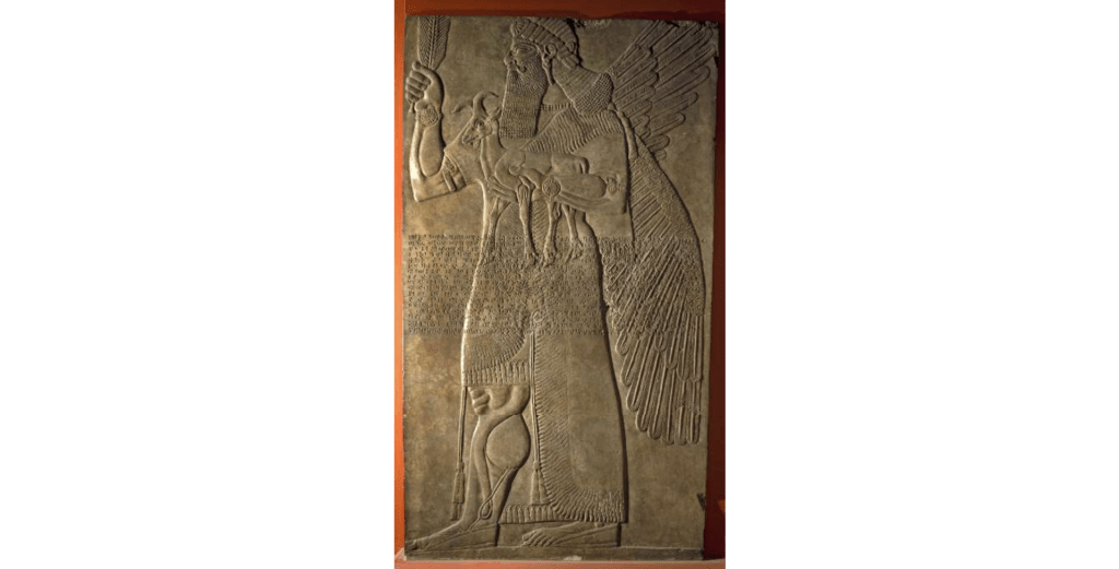 A Babylonian priest of Marduk, Apkallu depicted with a goat in hand. The goats are also found in Sumerian inscription collections. Mesopotamia, modern-day Iraq. Neo-Assyrian period, 865-860 BCE. The British Museum, London.
